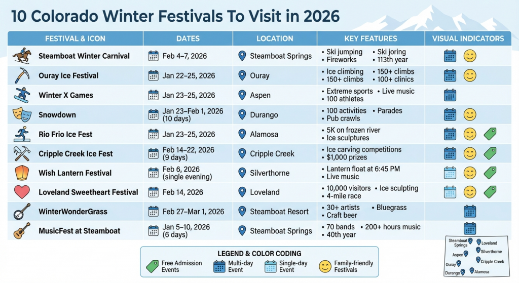 Colorado transforms winter into a season full of celebrations. From thrilling sports events to quirky local traditions, these festivals offer something for everyone. Whether you’re into skiing, ice climbing, bluegrass music, or snow sculptures, Colorado’s winter festivals promise unforgettable experiences. Here’s a quick look at 10 standout events: